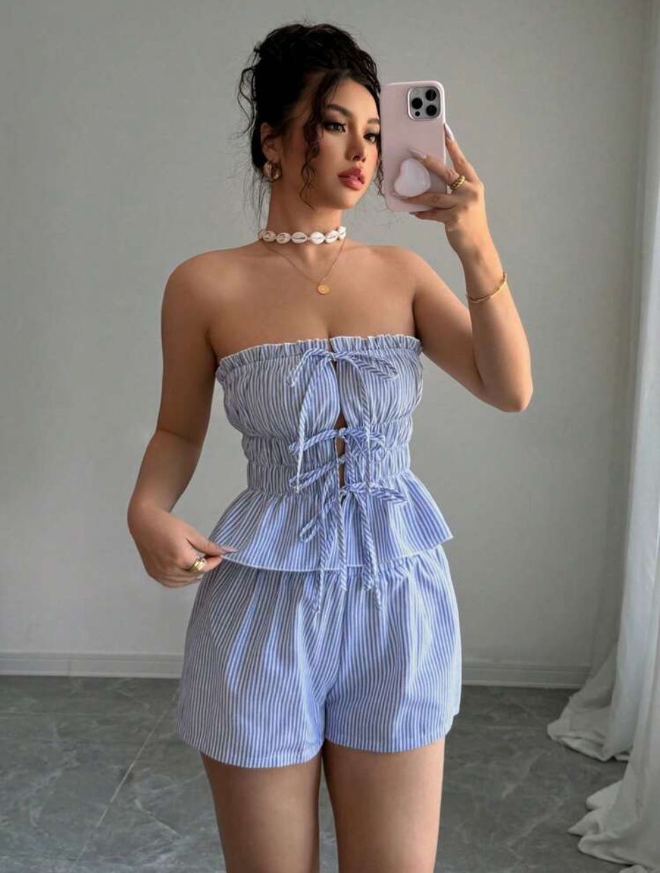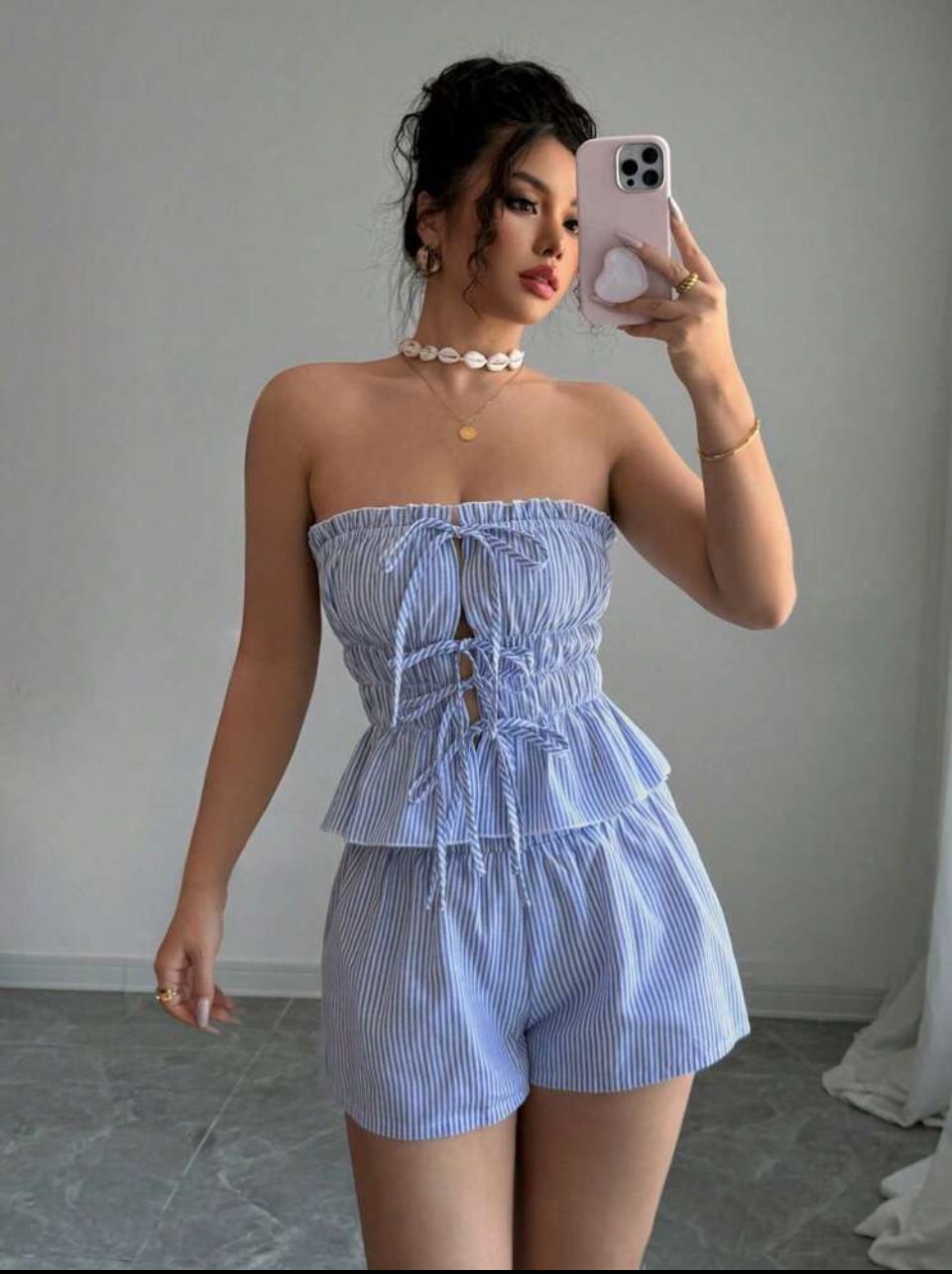 Este set de 2 piezas para vacaciones de verano combina estilo y frescura. El top corto sin tirantes destaca por sus volantes en el bajo que le dan movimiento y un lazo que añade un toque coqueto y atrevido. Perfecto para quienes buscan un look desenfadado y lleno de personalidad en los días más cálidos.